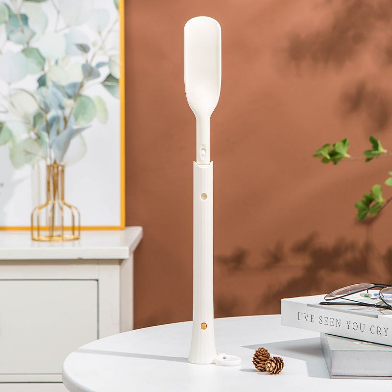 Unisex telescopic long-handled shoe horn extended, simplifying footwear application for all