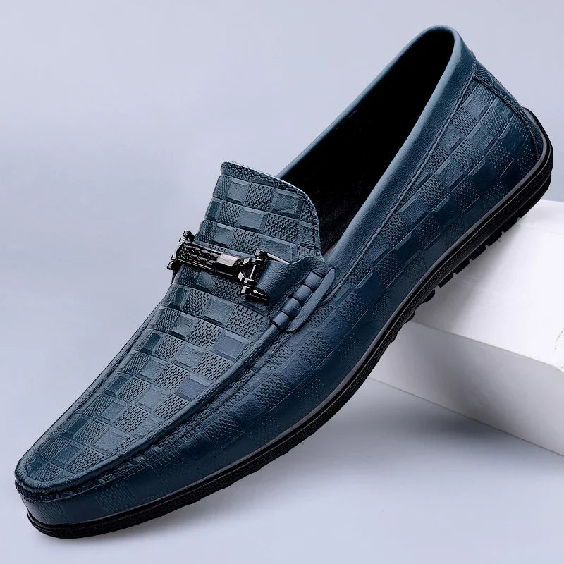 Step into sophisticated comfort with these men's premium leather bit loafers. Expertly fashioned from high-quality genuine leather, these timeless shoes are designed to provide enduring comfort throughout your day, thanks to their exceptionally cushioned insoles. The distinctive embossed check pattern, coupled with tasteful polished bit detailing, introduces a touch of refined elegance to your ensemble. A robust and dependable sole ensures stable footing with every stride. Engineered for practical versatility, these loafers effortlessly transition from professional settings to relaxed evening engagements, making them an indispensable addition to your footwear collection.