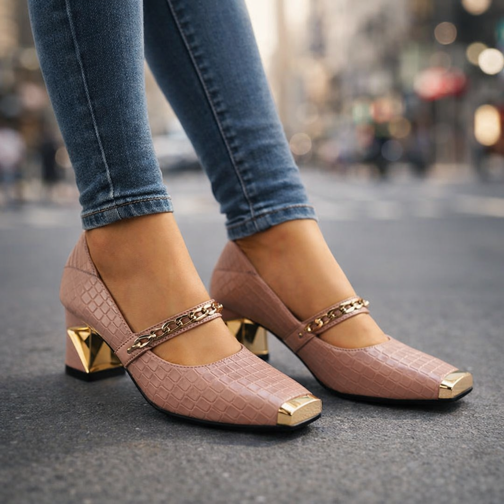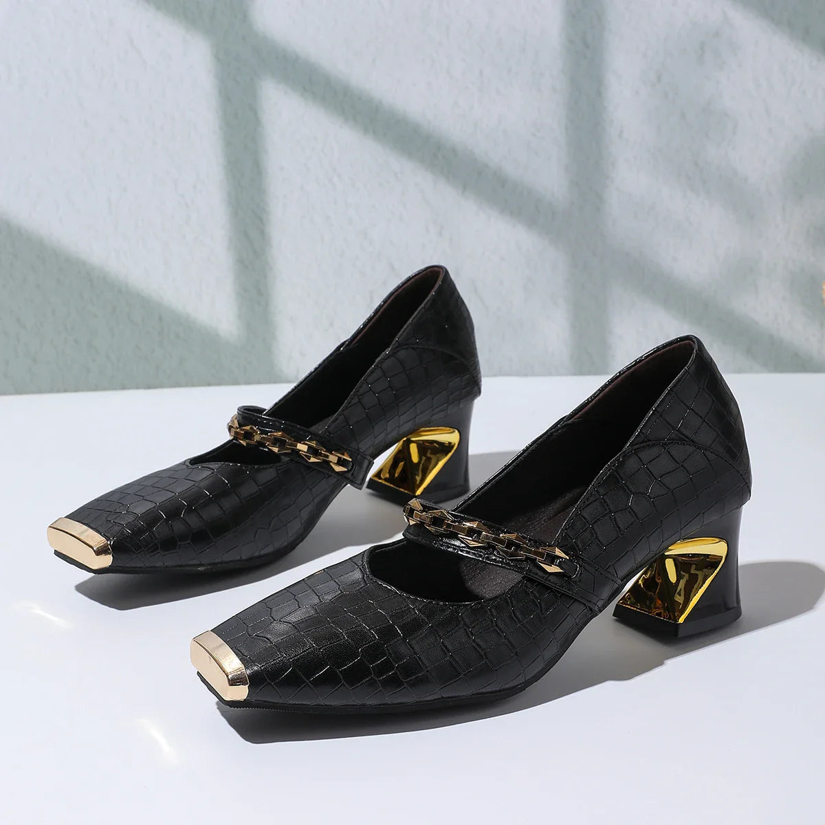 Elevate your look with these elegant block heel pumps, perfect for any sophisticated occasion. Crafted with a premium faux-leather upper, these heels feature a chic chain strap and a modern squared toe, enhanced with subtle metallic detailing for a refined finish. The stable, sculpted block heel provides both polish and comfort, making these an ideal choice for special events or stylish workday attire.